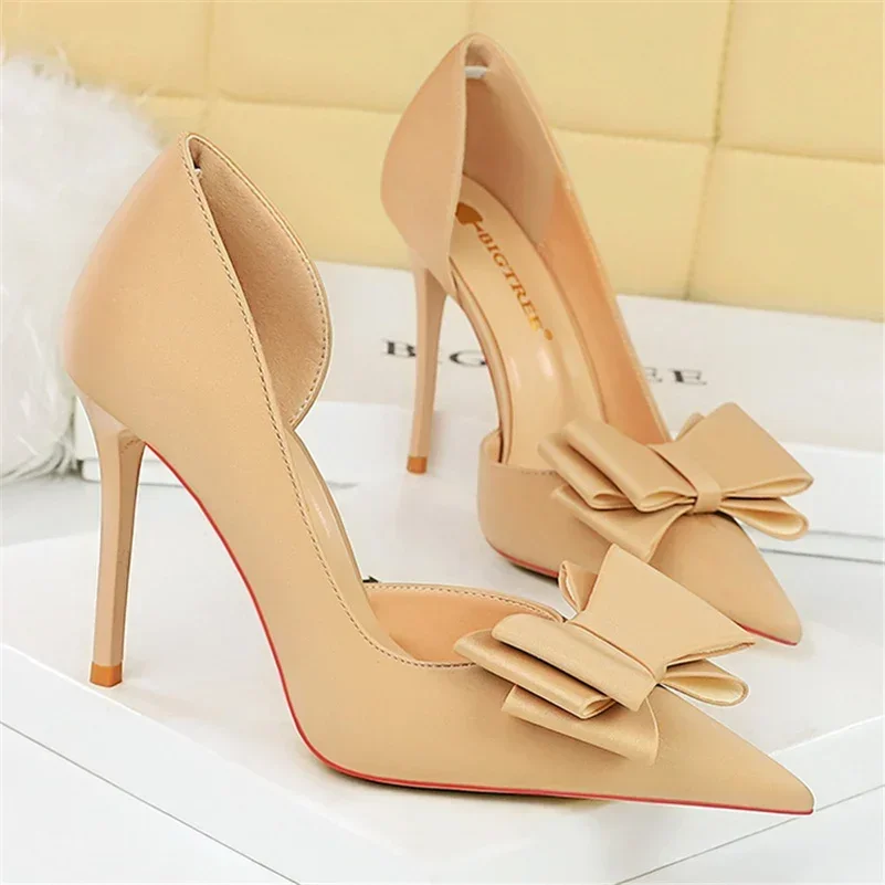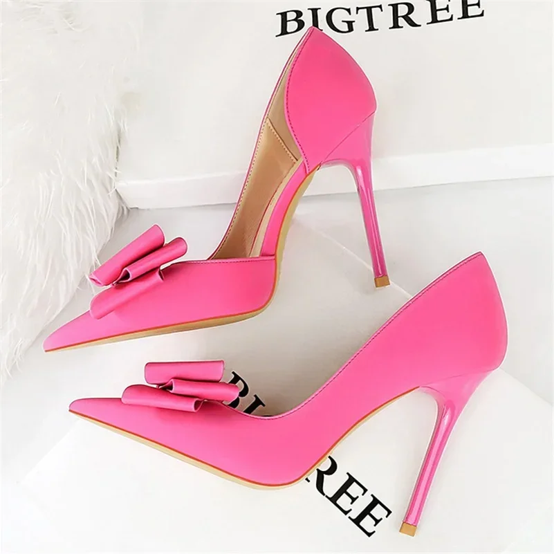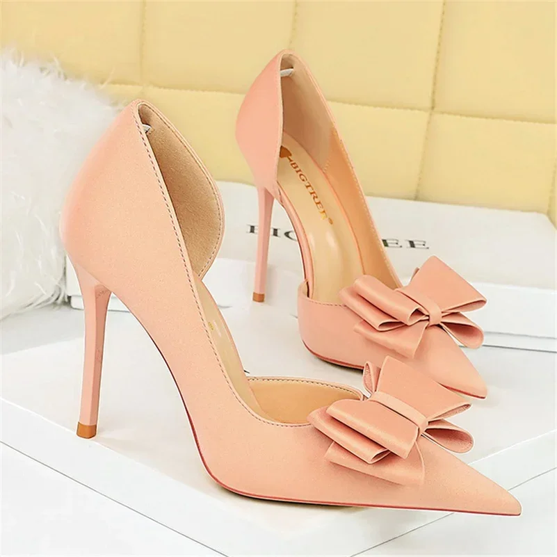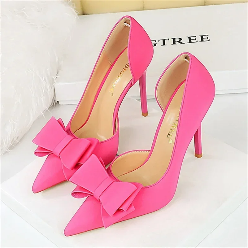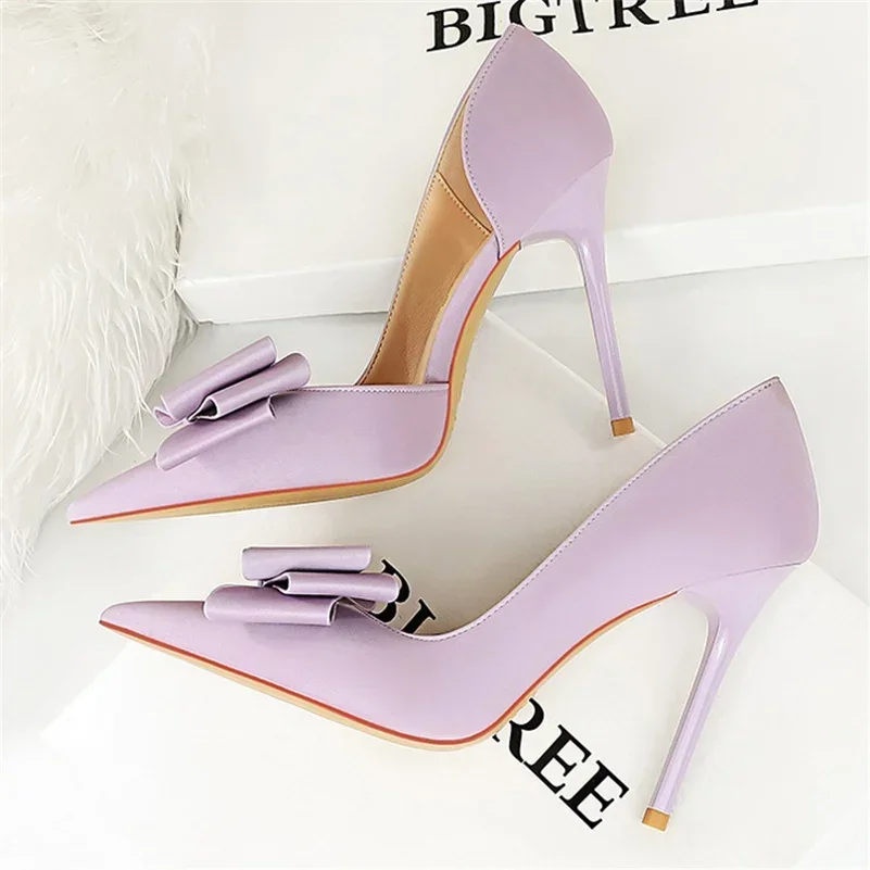 Saltos Altos Femininos de 10,5 cm 2024, Bombas Laterais Vazadas Doces Coreanas, Salto Kawaii com Laço em Verde e Roxo, Sapatos de Seda Satin para Festa e Formatura