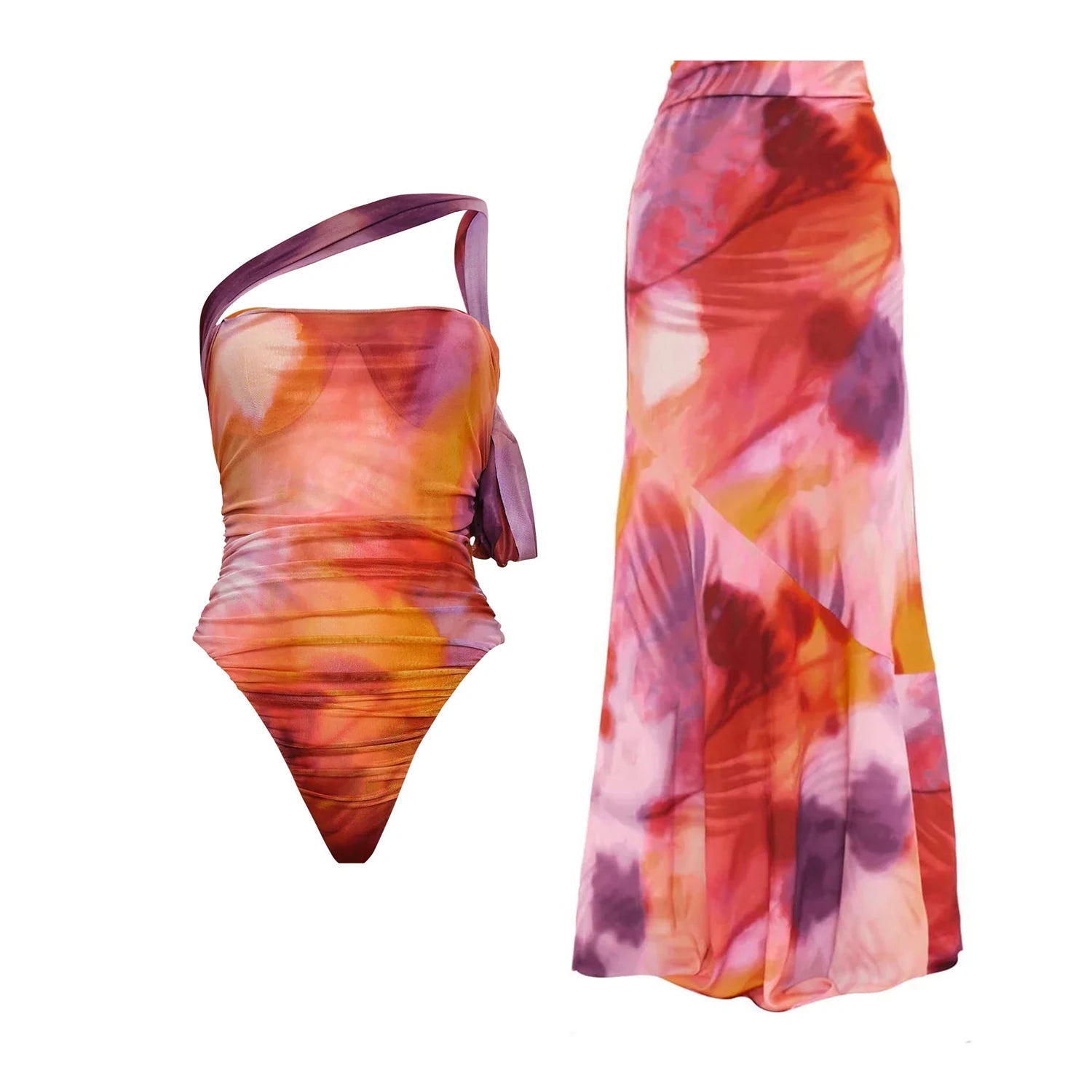 Maiô de Um Ombro com Capa 2Pc Biquíni Sexy para Mulheres, Roupa de Banho Floral, Biquíni Feminino com Push Up, Roupa de Praia