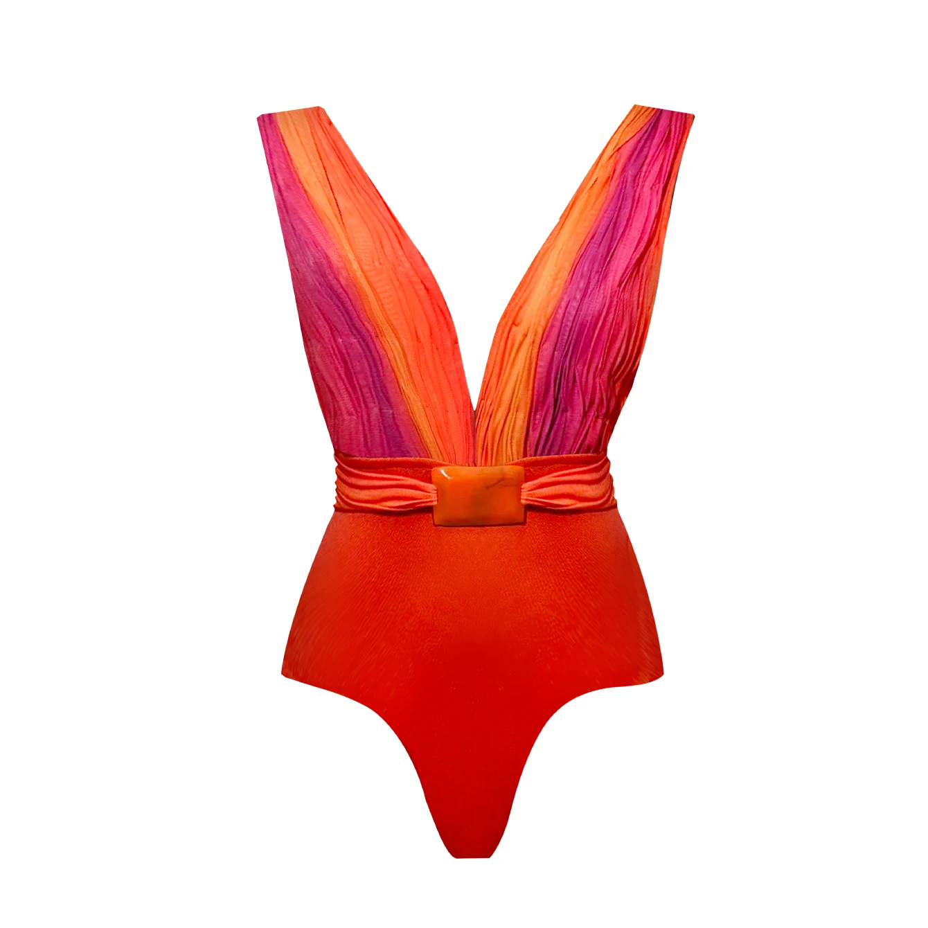 Maiô em 2 peças com decote em V profundo e saia longa, roupas de banho femininas sexy, biquíni brilhante, maiô estampado, moda de praia