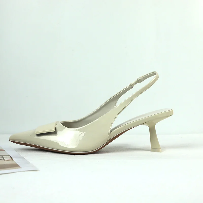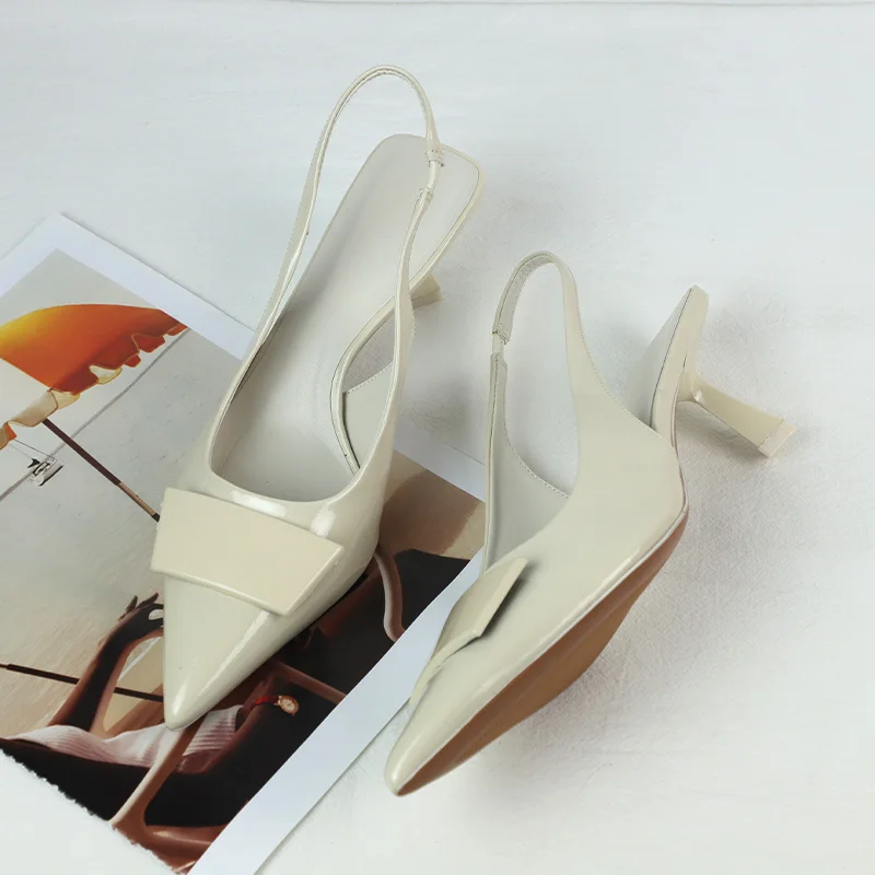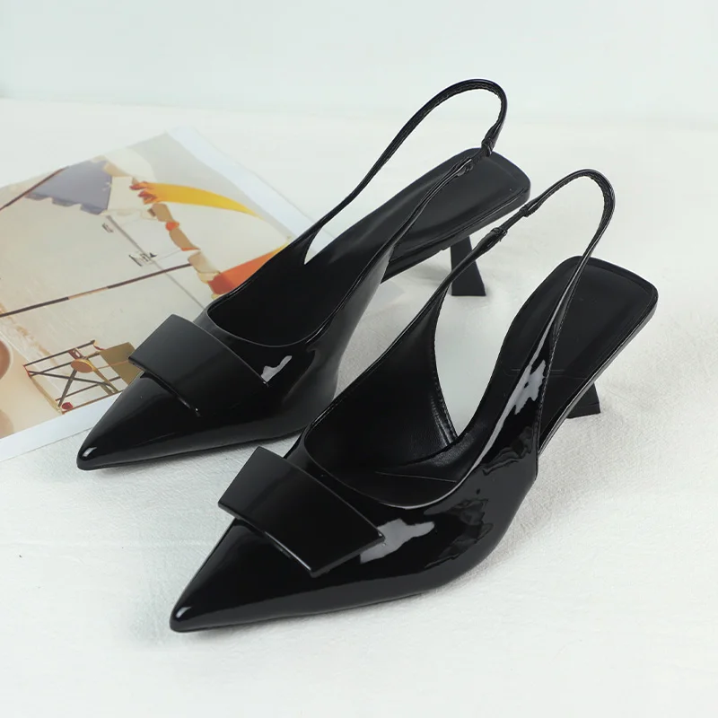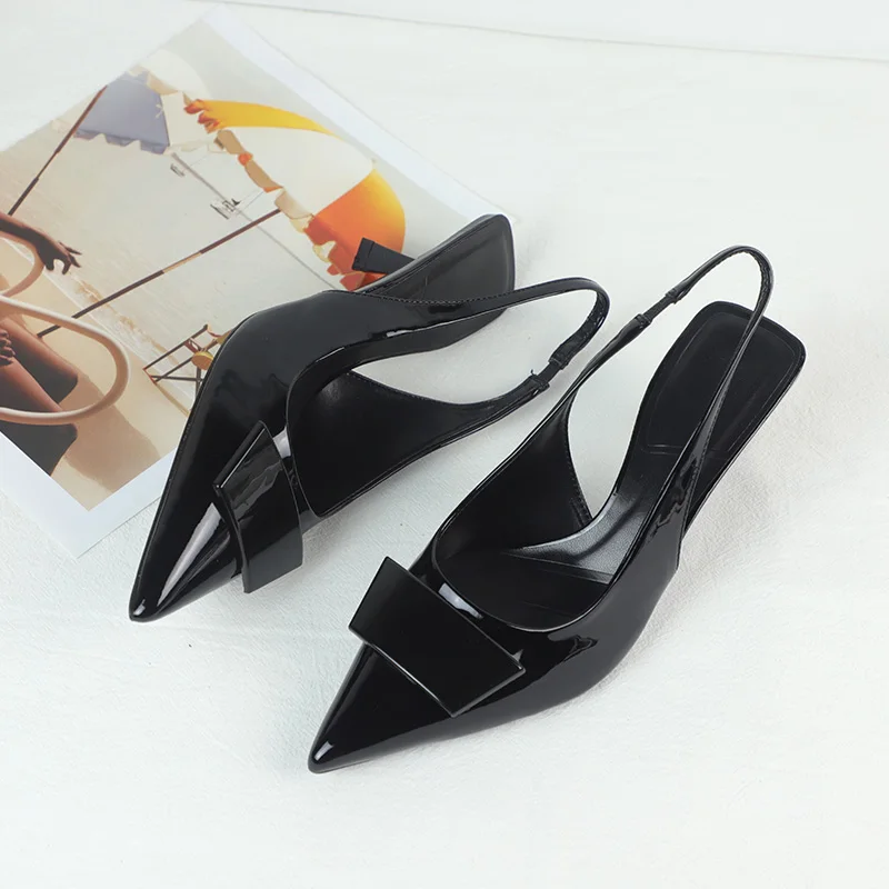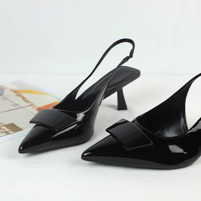 Sapatos de Negócios de Moda para Mulheres Sandálias Slingback Pretas de Couro Laqueado com Design Simples Verão 2025