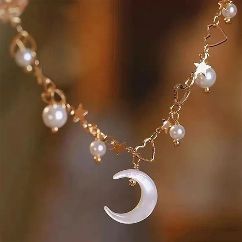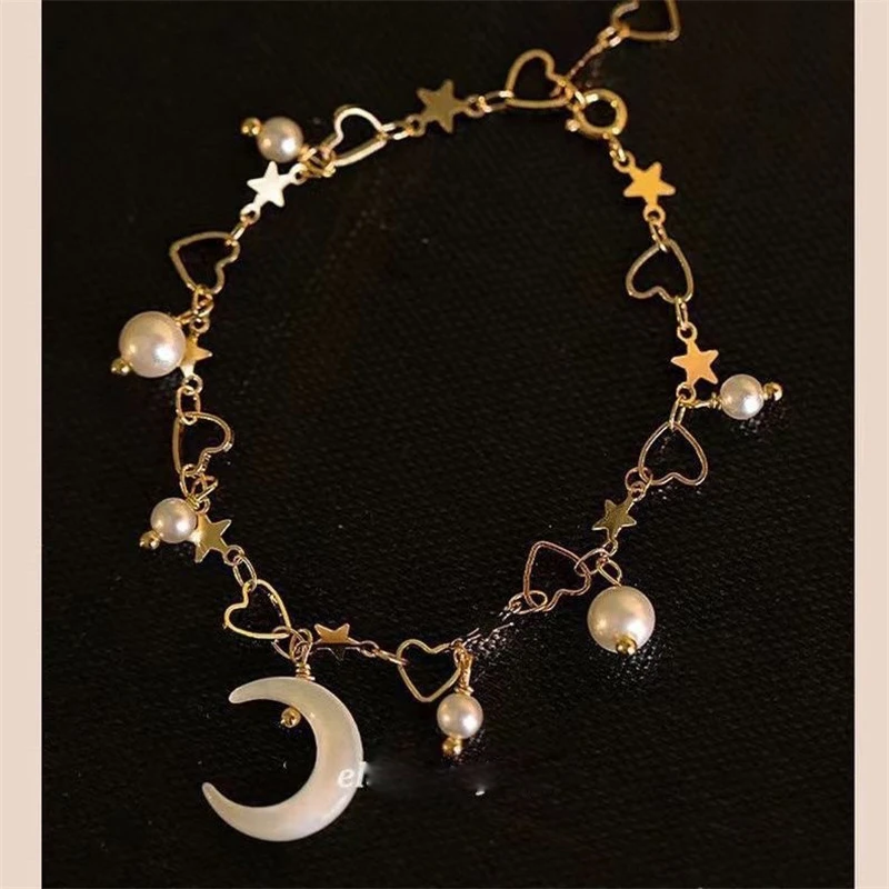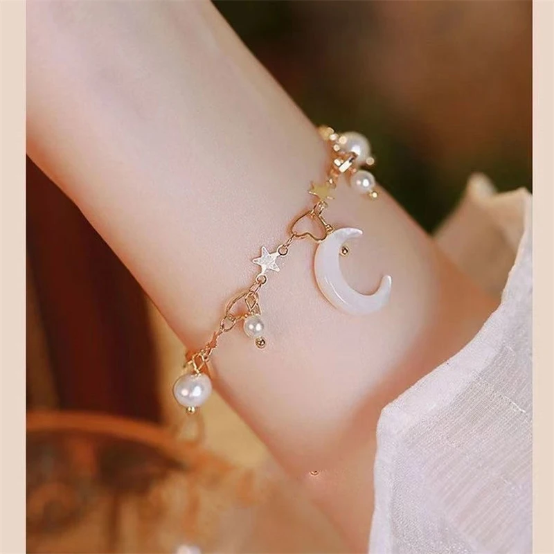 Pulseira de Pérola da Lua Coreana Romântica para Mulheres, Elegante e Exquisita, com Encanto de Estrela e Coração, Braceletes de Cadeia para o Natal.