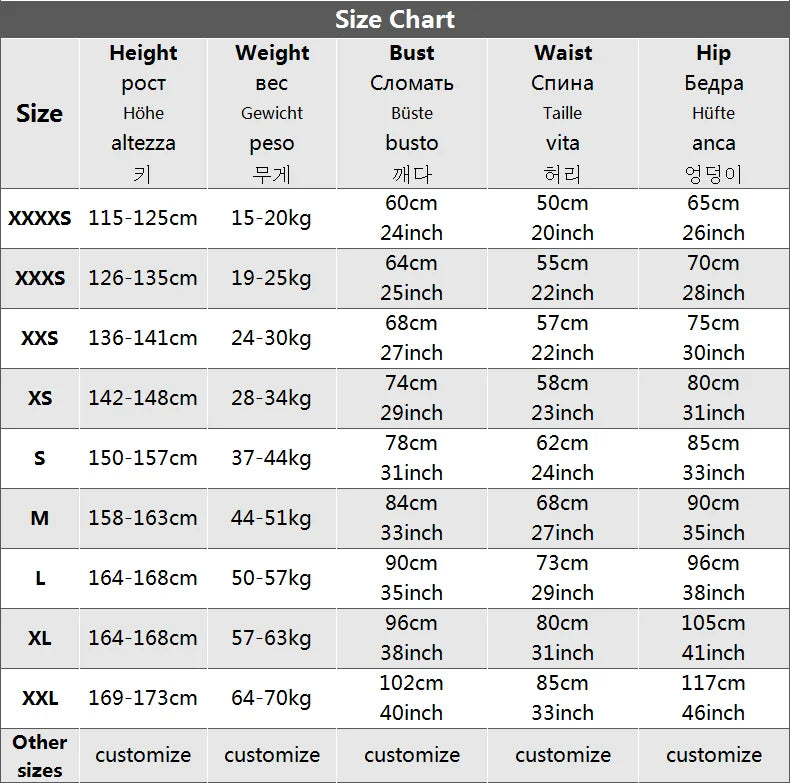 If the above sizes are not suitable for you, you can provide your size information (height, weight, bust, waist, hip) to us, We will customize clothes according to your size, but customized clothes do not support returns or exchanges.