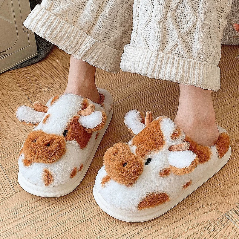 Pantufas de vaca de pelúcia para o inverno novo 2024, mulheres, slides de casa antiderrapantes, sapatos femininos macios com cobertura para os dedos, sapatilhas de algodão para o lar.